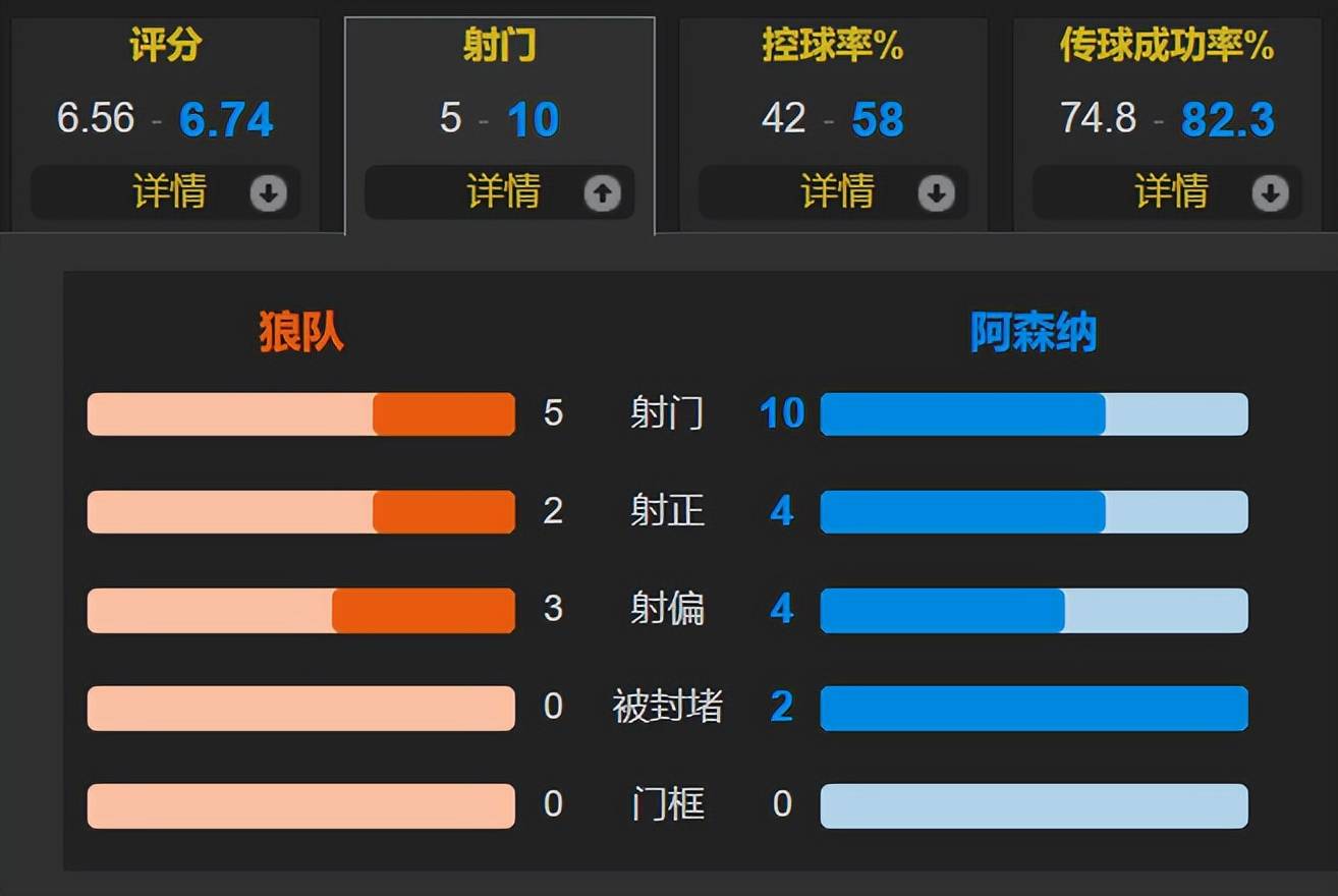 全场比赛,阿森纳的控球率为58%,一共有10次射门,其中4次射正;狼队一共有5次射门,其中2次射正。返回搜狐,查看更多
